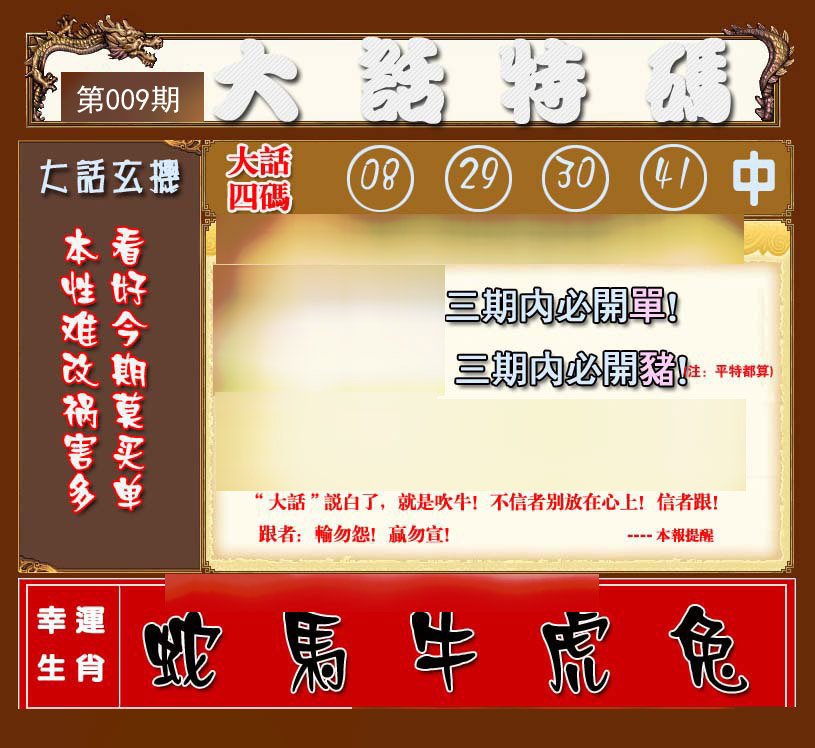 001期六肖中特【虎蛇猪狗牛鸡】开:龙38 |